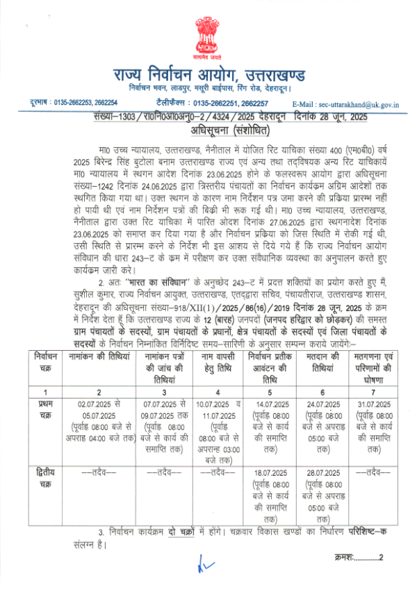 राज्य निर्वाचन आयुक्त ने बताया कि राज्य में हरिद्वार को छोड़कर अन्य 12 जिलों के 89 विकास खंडों में सदस्य ग्राम पंचायत के 55587, प्रधान ग्राम पंचायत के 7499, सदस्य क्षेत्र पंचायत के 2974 और सदस्य जिला पंचायत के 358 पदों पर निर्वाचन होना है।