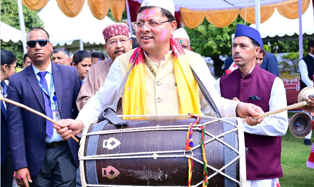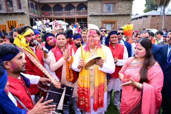 सीएम धामी के आवास में उड़ा अबीर गुलाल होल्यारों ने जमाया रंग