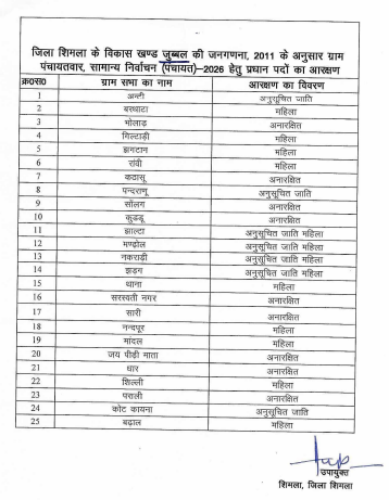 इसी तरह कुल्लू जिला में भी पंचायत प्रधान, पंचायत समिति सदस्य और जिला परिषद वार्डों के आरक्षण में संशोधन कर अंतिम सूची जारी कर दी गई है। सिरमौर जिला में उपायुक्त ने 6 अप्रैल को जारी अधिसूचना को निरस्त कर नई अधिसूचना लागू कर दी है। मंडी जिला में जिला परिषद के 36 वार्डों में से 18 सीटें महिलाओं के लिए आरक्षित की गई हैं, जबकि शेष सीटों को विभिन्न वर्गों में बांटा गया है। हमीरपुर जिला में 242 पंचायतों का रोस्टर जारी कर कई वार्डों के आरक्षण में बदलाव किया गया है।